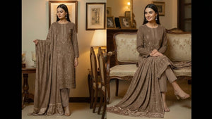 Earthy Brown with Heavily Embroidered Velvet Shawl - 3-Piece Luxury Embroidered Suit