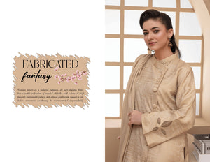The Fabric: Textured Warmth Crafted from premium Dyed Winter Jacquard, this fabric features a rich, self-woven pattern that adds depth and character to the solid beige tone. It captures the light with a soft, champagne-like sheen, offering a look that is both festive and sophisticated.