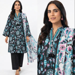 Black & Turquoise Paisley Printed Khaddar 3-Piece Suit - Unstitched