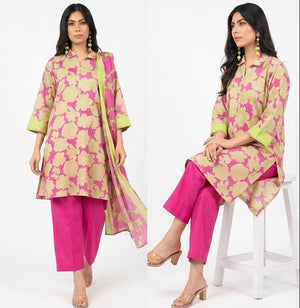 Pink & Lime Printed Khaddar 3-Piece Suit - (Unstitched)