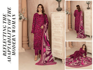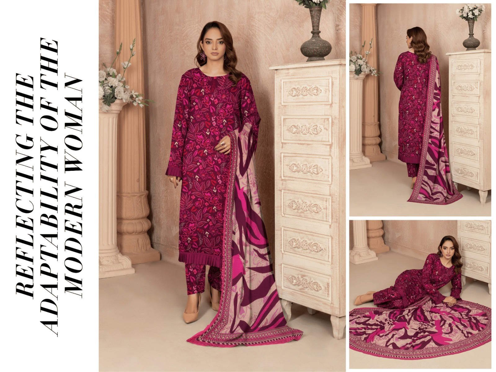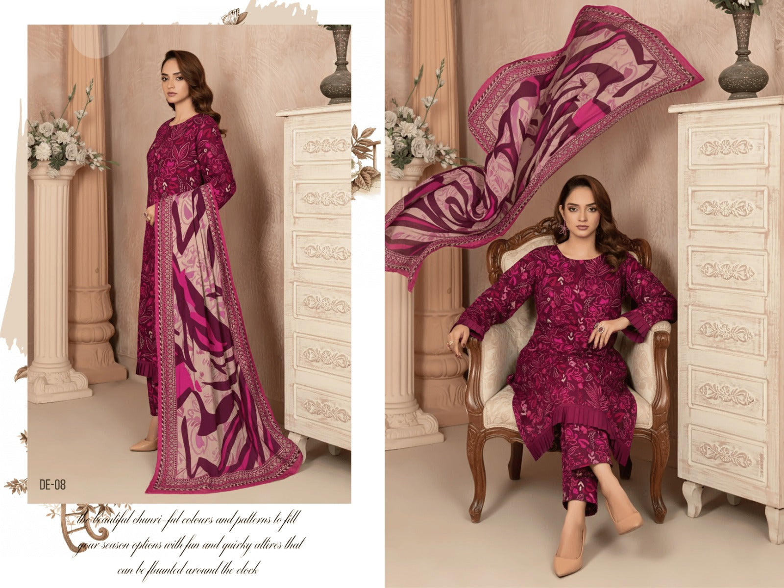 Wrap yourself in sophistication with Berry Velvet (DE-08). This luxurious 3-piece ensemble features a stunning deep magenta canvas that perfectly captures the mood of the season. It is designed for the modern woman who wants a look that is both traditional in its roots and contemporary in its execution.