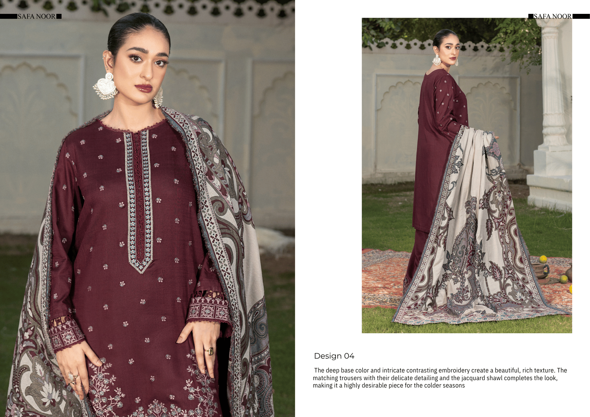 The shirt features intricate contrast embroidery on a rich maroon base, giving it a timeless, royal appeal. Paired with matching warm-slub trousers and topped with a Premium Jacquard Shawl adorned with elegant motifs, this ensemble offers a complete winter look that feels cozy yet undeniably premium.