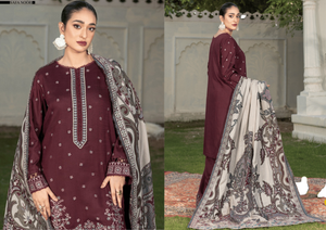 Deep Maroon Embroidered Warm Slub 3 Piece Suit with Premium Jacquard Shawl – Winter Collection