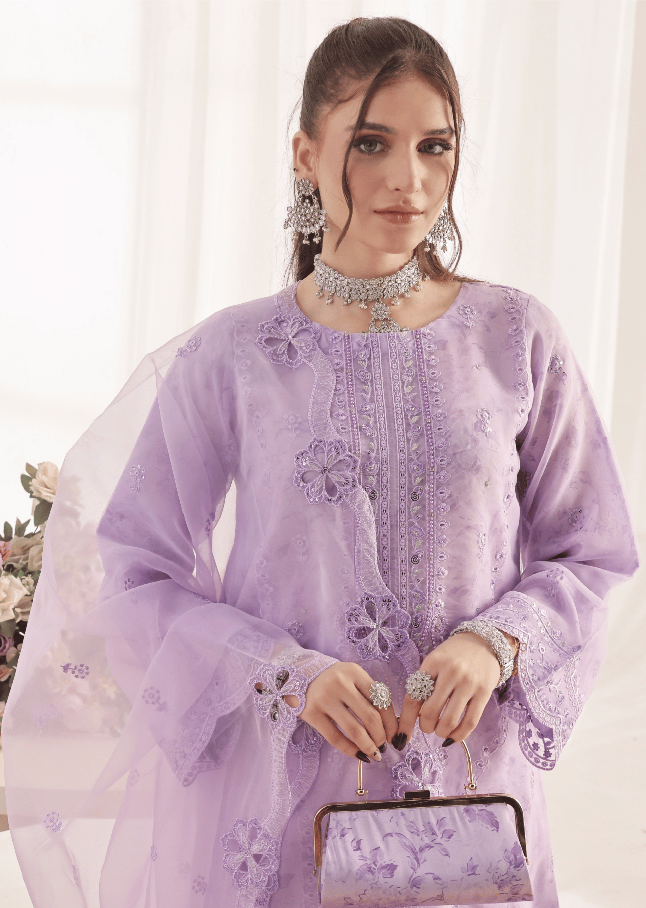 Elegant Embroidered Lilac Organza 3-Piece Suit with Matching Clutch