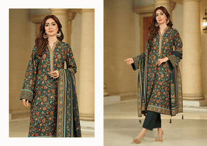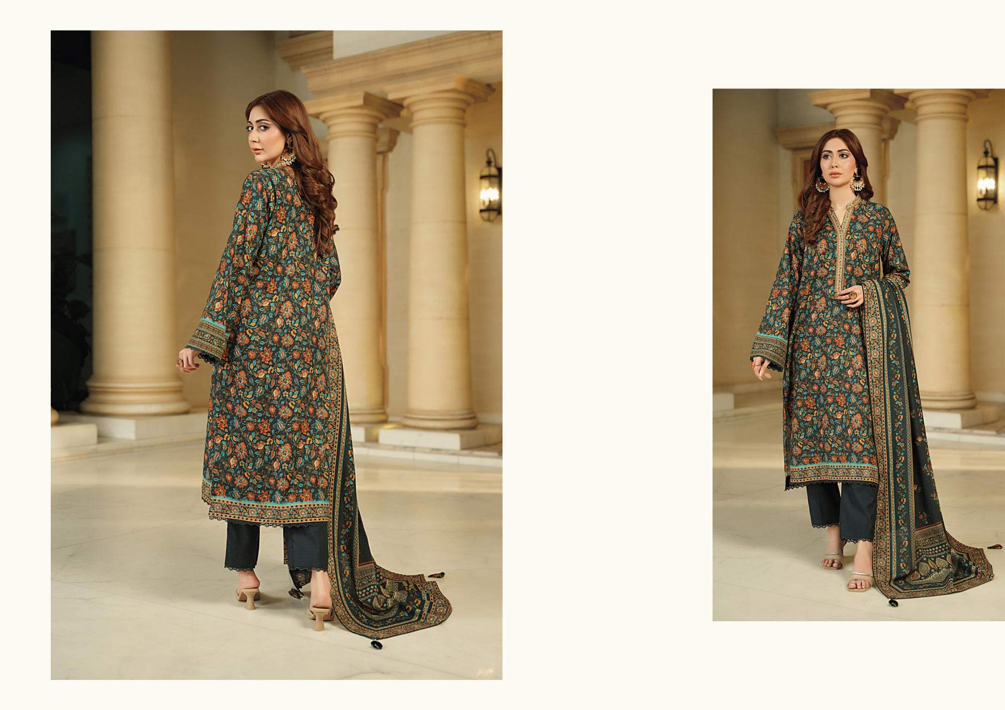 The digital printed Khaddar shirt showcases intricate floral artistry, making it perfect for both casual outings and semi-formal gatherings. Paired with a luxuriously draped digital printed Khaddar dupatta, the ensemble feels complete, polished, and truly eye-catching. The dyed trouser adds a refined balance, giving you a look that stands out gracefully in every setting.