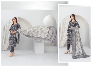 Featuring a beautifully crafted grey embroidered shirt, matching trousers, and a premium printed khaddar dupatta, this outfit blends comfort with timeless sophistication. The soft winter khaddar fabric ensures warmth, while the intricate floral embroidery adds a luxurious festive touch.