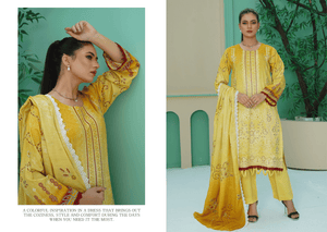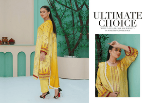 The look is tied together with a flowy Diamond Slub Dupatta, featuring a matching yellow print and finished with delicate white lace on all four sides. It is the perfect fusion of tradition and chic modernity.