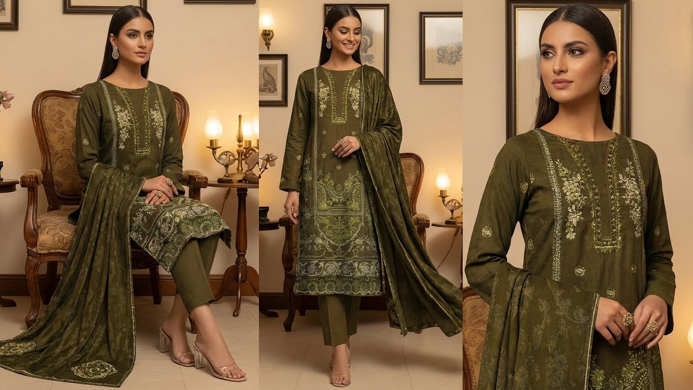 Premium Olive Green Embroidered 3-Piece | Luxury Velvet Shawl Series