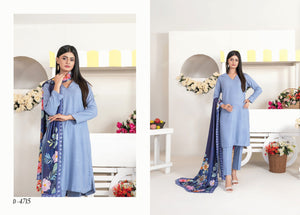 The solid blue shirt serves as a pristine canvas, featuring a smooth, premium texture that feels luxurious against the skin. The ensemble is dramatically enhanced by the Navy Blue Digital Printed Shawl. This contrasting masterpiece features a cascade of vibrant floral motifs in pinks, oranges, and greens, creating a striking visual balance between the cool suit and the warm, rich print of the drape.