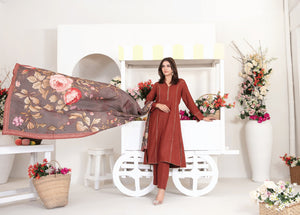 The solid Rust shirt features a subtle, premium texture that exudes quality and durability. The centerpiece of this outfit is the magnificent Digital Printed Shawl. Set against a dark charcoal-brown background, the shawl features oversized, romantic floral blooms in soft pinks and creams, creating a stunning contrast that perfectly complements the deep earth tones of the suit.