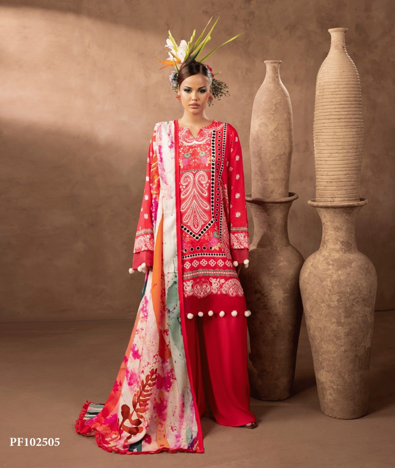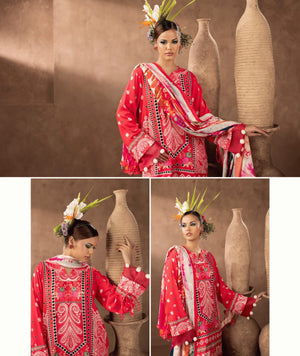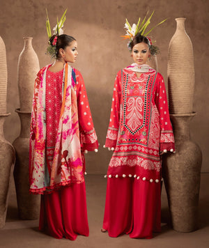 Own the moment with this Premium Twill Marina 3-Piece Suit from Nagi Collections — a radiant ruby red ensemble designed to make every appearance unforgettable. Crafted in Pakistan from luxurious Twill Marina, this set blends bold color, refined print work, and refined finishing details to deliver a look that’s both modern and timeless.
