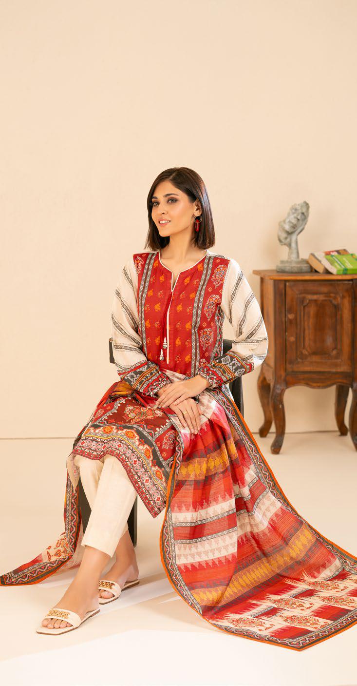 The show-stopping Printed Khaddar Dupatta is a work of art, with bold, Ikat-style stripes of red, mustard, and white that drape with pure elegance.