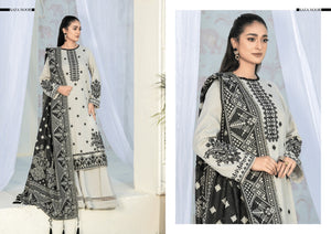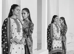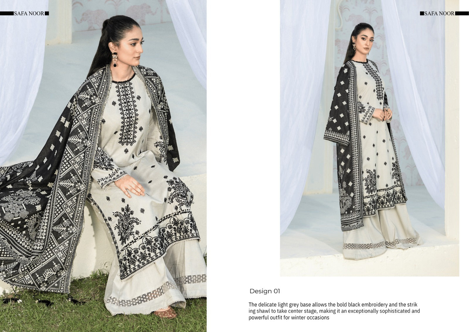 Discover the charm of simplicity with Design 01 from our winter collection. This ensemble is a masterclass in sophistication, featuring a delicate light grey base that serves as the perfect canvas for bold, high-contrast black embroidery.