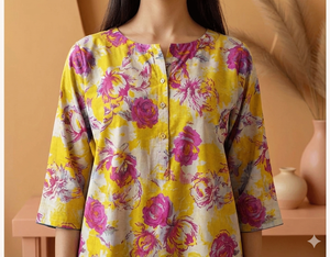 Crafted from our warm, durable Khaddar fabric, this suit offers the perfect shield against the chill while keeping you comfortable all day. The design features a lively, artistic floral print where bold splashes of fuchsia and deep purple bloom across a radiant yellow canvas. It is a painterly, watercolor-inspired look that feels both artistic and trendy.